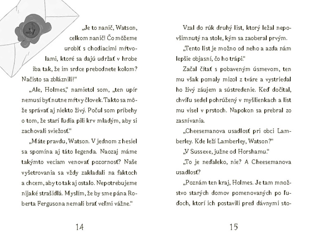Tentoraz na nich čaká hádam najpodivnejší prípad, aký kedy riešili. Do Holmesovej kancelárie zavíta rozrušený pán Robert Ferguson, ktorý sa obáva, že jeho manželka je upír. Nachytal ju, ako hryzie do krku ich synčeka, a ona sa pred ním odvtedy zamyká vo svojej izbe.