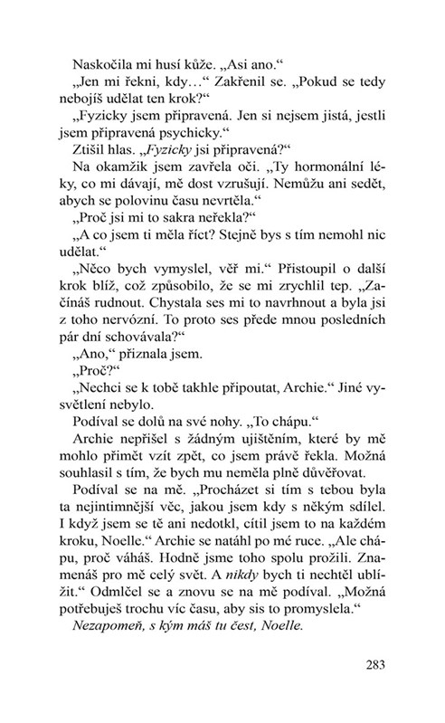 Po těžkých začátcích jsme si s Archiem jednoho dne nečekaně začali rozumět, a nakonec se z nás stali přátelé. Sdíleli jsme spolu tajemství a sblížili se při ranním běhání. Zjistila jsem, že Archie má divokého ducha a že se ze všech sil snaží přizpůsobit očekáváním svého otce.