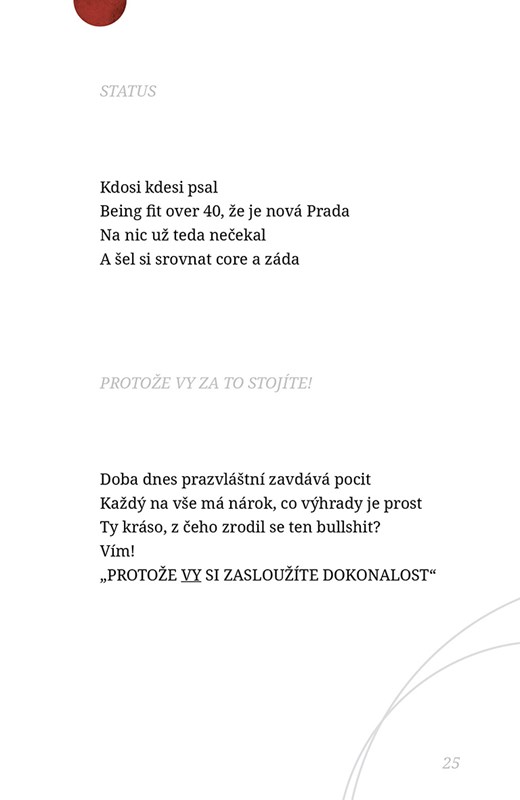 Verše, do nichž autorka shrnula svůj pocit ze světa. Krátké, hutné, vtipné, sprosté a naivní. Někdy klišé, často kýč. Deprese míchaná s humorem. Nekorektní, osobní, ale zarezonují.