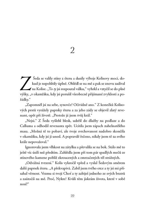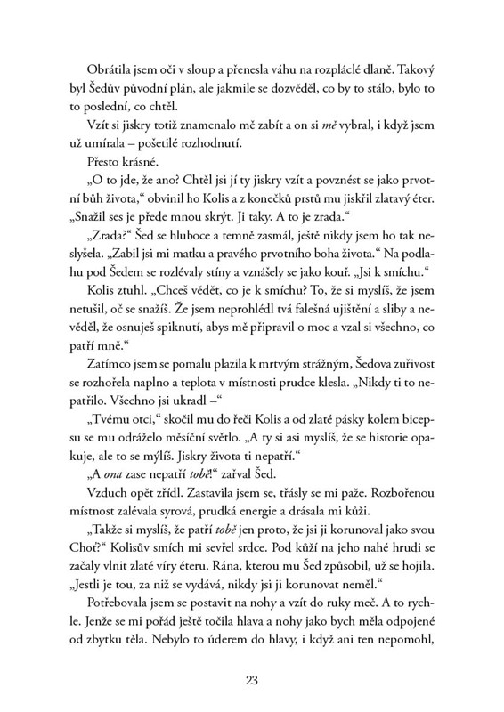 Sera i svůdný vládce Země stínů padli do zajetí falešného Krále bohů. Existuje jediná věc, která může Nykta osvobodit a zabránit invazi do Dalosu. Zdrcující odhalení v Kolisově zajetí však zpochybní nejen vše, co si Sera myslela o svých povinnostech a samotném vzniku říše, ale také zdroj skutečné hrozby. Nyktos udělá cokoli, aby svou lásku udržel naživu a dopřál jí osud, který si zaslouží. Dokonce bude riskovat úplné zničení říší… a přesně to nastane, pokud se Sera nepovznese jako prvotní bohyně života.
