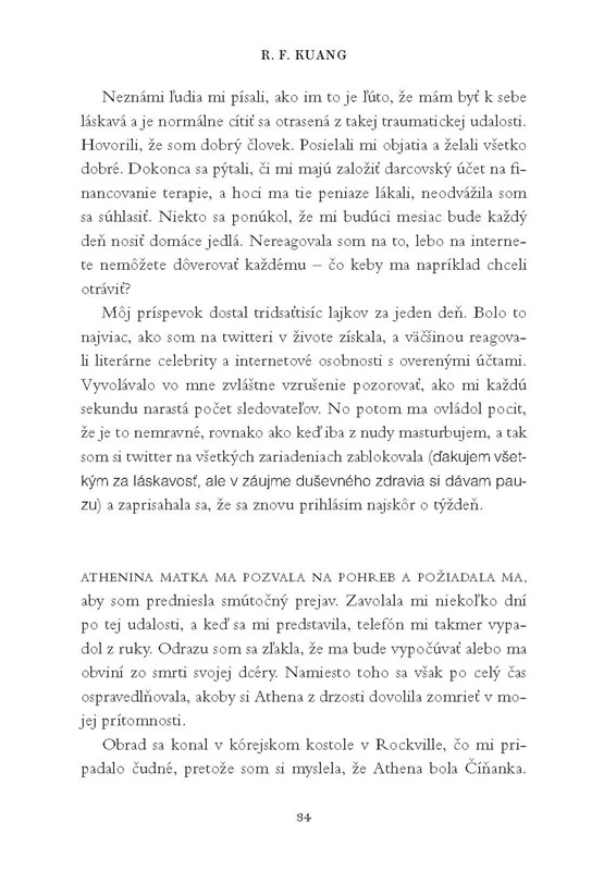 June Haywardová a Athena Liu sa mali spoločne stať vychádzajúcimi literárnymi hviezdami. Athena je miláčikom literárnych kruhov, o June sa to však povedať nedá. Kto by už len čítal knihy o obyčajných belošských dievčatách?