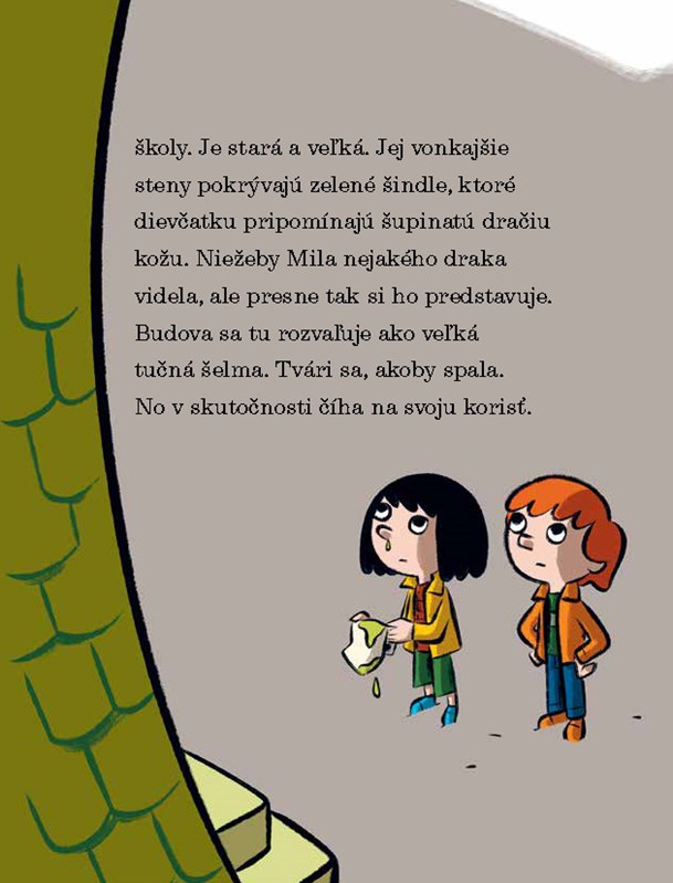 „Škola ťa predsa nezje,“ vraví Milin ocko. Ale je to pravda? Veď škola vyzerá dosť nebezpečne so svojimi veľkými očami a zelenými šindľami, ktoré sa lesknú ako dračia koža. Počas dňa otvorených dverí sa naozaj stane veľa čudesných vecí. A keď niektoré deti zo školy dokonca zmiznú, Mila a jej kamarát Ben sú odhodlaní prísť ta