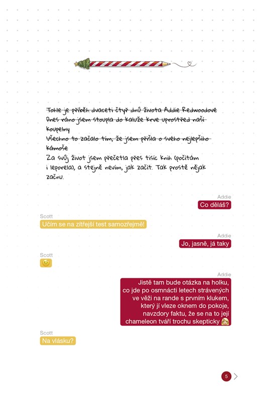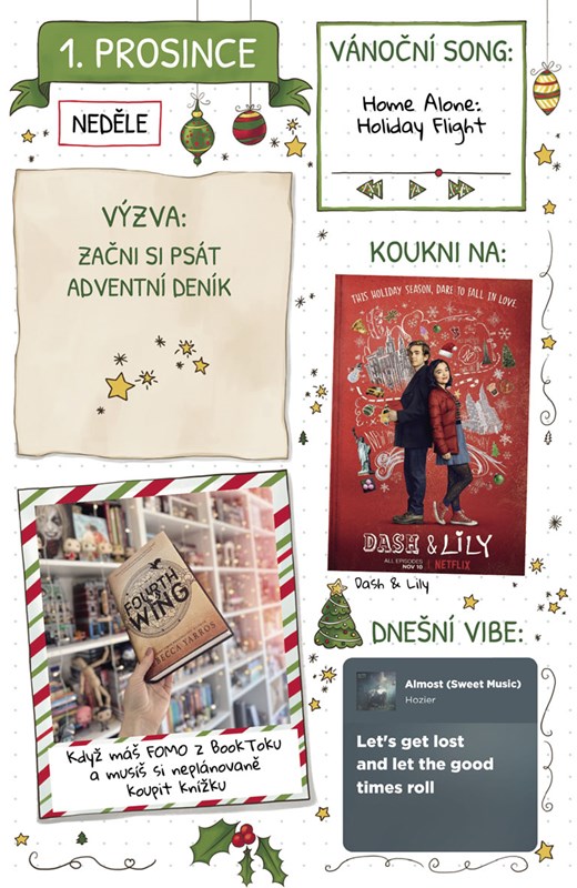 Pro Addie jsou Vánoce nejlepší část roku, letos to ale vypadá na propadák. Máma s tátou jsou pryč, nejlepší kámoš se stěhuje, navíc ji pomlouvá půlka školy. Jenže 1. prosince se stane něco, díky čemu dá svátkům ještě šanci: dostane adventní kalendář plný úkolů a potkává Jaxona, který se měl úplně jinde chystat na kariéru v NHL. Místo toho se objeví v jejím oblíbeném knihkupectví a nabízí jí, aby s ním naoko chodila. A ona souhlasí… Rozstřihni si každý den kapitolu a prožij s Addie celý advent!
