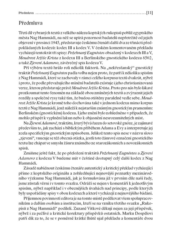 Jak už se čtenáři mohli dozvědět z předešlých svazků „Rukopisů z Nag Hammádí“, byly v prosinci 1945 v blízkosti vesnice Nag Hammádí v horním Egyptě objeveny papyrové kodexy obsahující (jak dnes víme) 52 koptsky psaných spisů. Třetí svazek řady přináší v českém komentovaném překladu další tři z nich: Požehnaný Eugnóstos, Moudrost Ježíše Krista a Zjevení Adamovo. První dva traktáty popisují za pomoci židovských a platónských představ nebeský svět a přinášejí čtenáři poučení o nejvyšším transcendentním Bohu a jeho emanacích – Požehnaný Eugnóstos v podobě filosofického pojednání ve formě dopisu, Moudrost Ježíše Krista pak v raně křesťanských textech oblíbenou formou dialogu mezi Ježíšem a jeho učedníky. Spis nazvaný Zjevení Adamovo obsahuje zjevení, které obdržel Adam před svou smrtí od tří nebeských bytostí a jež předává svému synu Sétovi. V úvodu k celému svazku se W. B. Oerter zabývá historií nálezu a vydání, fyzickým vzhledem, jazykem a písmem kodexů, z nichž byly texty vybrány, nalezneme tu ale též zajímavé úvahy o tom, jak byly jednotlivé kodexy komponovány jako celek. Rozhodující pro výběr textů do jednoho kodexu nebylo zjevně společné téma procházející všemi spisy, ale spíše to, nakolik každý jednotlivý spis mohl přispět celku kodexu svou zvláštní funkcí.