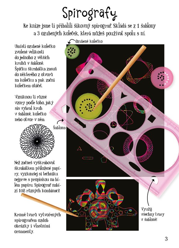 Vytvoř si fascinující obrázky s pomocí praktického škrabátka a ozubeného spirografu!