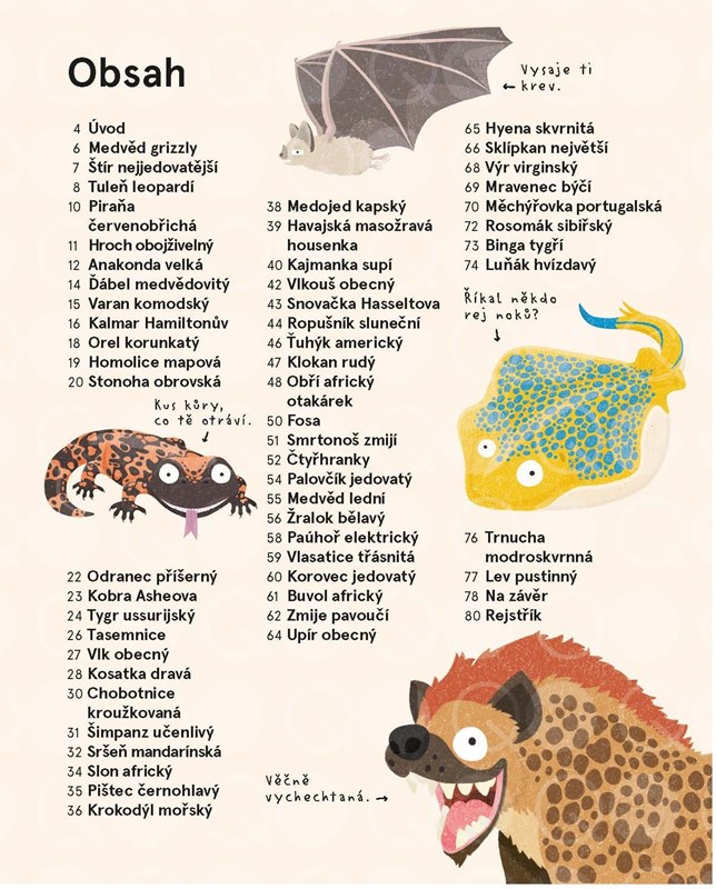 Je tady třetí z edice zábavných encyklopedií Philipa Buntinga – tentokrát ze světa zvířat, která lidem nahánějí největší strach. Připravte se na pořádně žravé žraloky, strašlivé obří sršně, vážně šokující elektrické úhoře, hrozivě hladové hrochy i chechtající se krvelačné hyeny. Opravdu si svoji neblahou pověst zaslouží? To zjistíte v této báječné knize, která vám zaručí tu pravou zvířecí zábavu! Zkrátka a dobře, tohle je nejvtipnější encyklopedie zvířat, kterých se bojí i strašidla pod postelí! (A přitom by třeba ani nemusela, kdyby si tuhle knihu přečetla!)