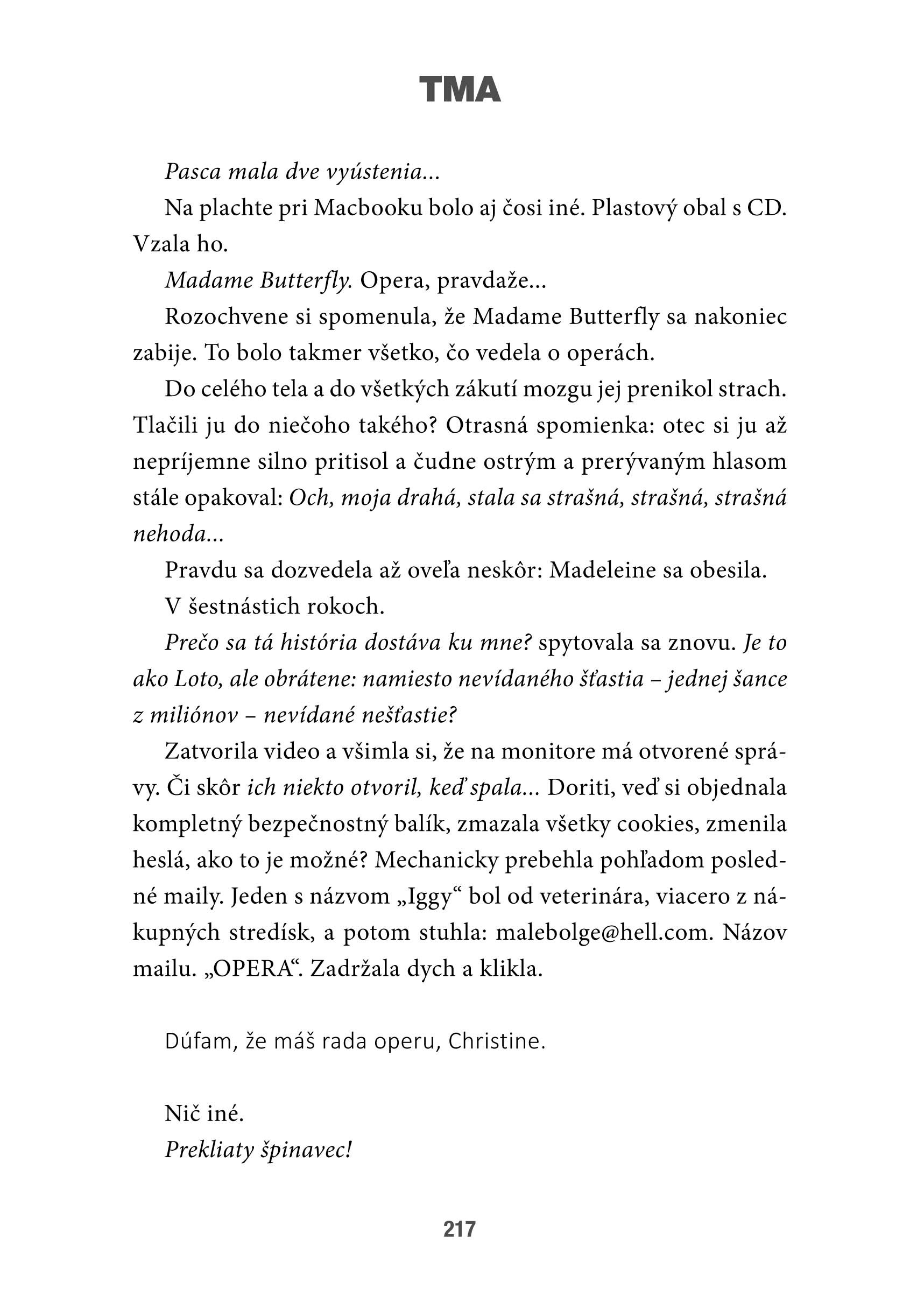 Keď Martin Servaz dostane obálku s kartou od hotelovej izby, v ktorej pred rokom spáchala samovraždu nejaká umelkyňa, je jasné, že si niekto praje, aby sa vrátil späť do práce.