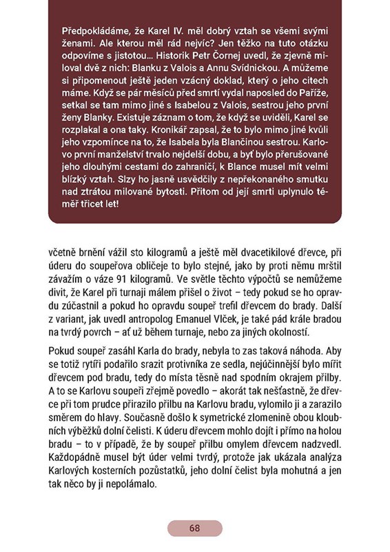 Jaké byly porody mladé císařovny Sisi? Jak se asi starali o Karla IV., když byl po úrazu několik týdnů nehybný? Jak Marie Terezie vychovávala svoje děti a měla opravdu nejradši dceru Marii Kristinu? Jaký byl Franz Josef šéf... a milenec? Sžil se Jan Lucemburský se svou slepotou? A co prožívala kněžna Ludmila, když ji škrtili? Jestli vás o českých panovnících zajímá víc než jen to, co jste se o nich dozvěděli ve škole, v téhle knize plné ověřených detailů z jejich životů si přijdete na své.