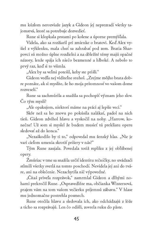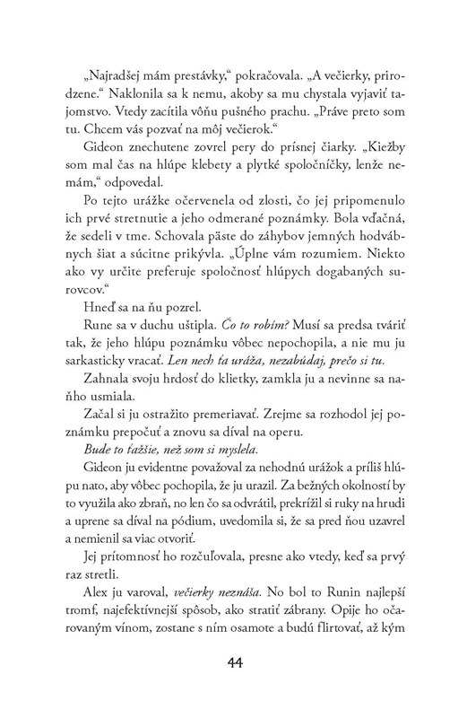 Rune je láskavá, odhodlaná, odvážna a rozhodne aj poriadna badass hrdinka. Nebojí sa riskovať a bojuje za to, v čo verí, čím si ma okamžite získala. Gideon je postava so zaujímavou minulosťou – jeho zlé skúsenosti s čarodejnicami ho formovali a urobili z neho tvrdého, nekompromisného človeka, ktorý je presvedčený o svojej pravde. Medzi Rune a Gideonom funguje určitá chémia a ich interakcie sú napínavé, ale zároveň som si nebola istá, či by ich vzťah mal nejakú budúcnosť. Ich povahy sú veľmi odlišné a stále medzi nimi existuje obrovská priepasť rozdielov, ktorá ich oddeľuje. Niekedy som mala pocit, že ich spája len táto nebezpečná hra, kde sa neustále snažia prekabátiť jeden druhého – chvíľami ako mačka a myš, pričom vôbec nebolo jasné, kto je kto. Práve tento aspekt ich dynamiky ma bavil najviac, ale zároveň som zostala na pochybách, či by ich vzťah dokázal fungovať aj bez toho napätia a konfliktov.