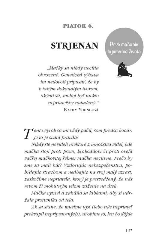 Vziať si príklad z mačky a jej rozhodnutí, prekonať strach, nikdy sa nevzdať a zmeniť svoj život. Na stránkach tejto knihy objavíte obdivuhodnú hodnotu mačacích rád, ktorá búra bariéry medzi človekom a zvieraťom.