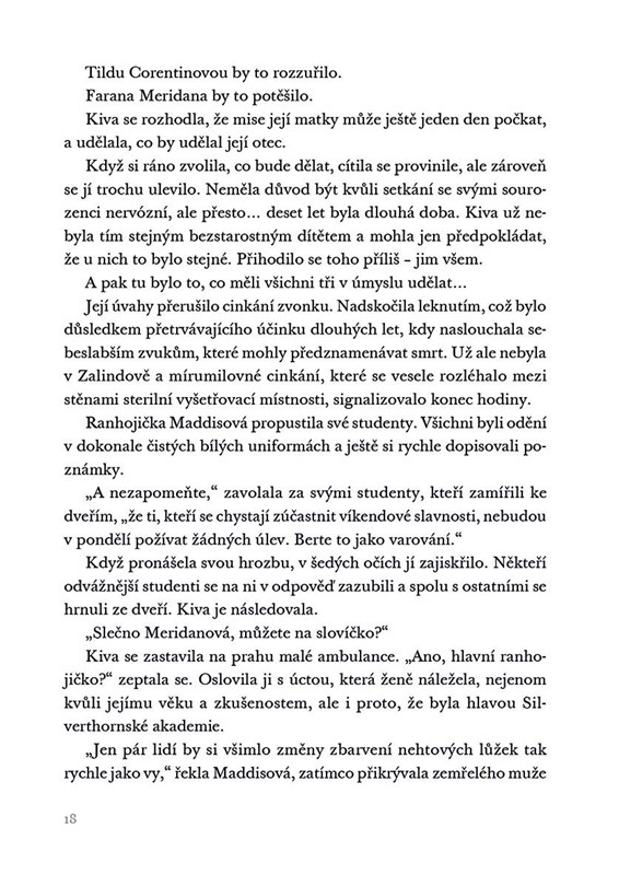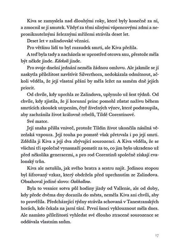 Kiva Meridanová přežila zalindovské vězení i zkoušky utrpením. Opravdová svoboda na ni ale nečeká. Cítí, že jen vyměnila vězeňské mříže za zlatou klec královského paláce. A tak zatímco si zvyká na život v hlavním městě, myšlenky na pomstu ji neopouštějí. Ale za deset let, co byla pryč, se její sourozenci změnili a Kiva brzy zjišťuje, že svá tajemství bude muset chránit nejen před nepřáteli, ale i před vlastní rodinou.