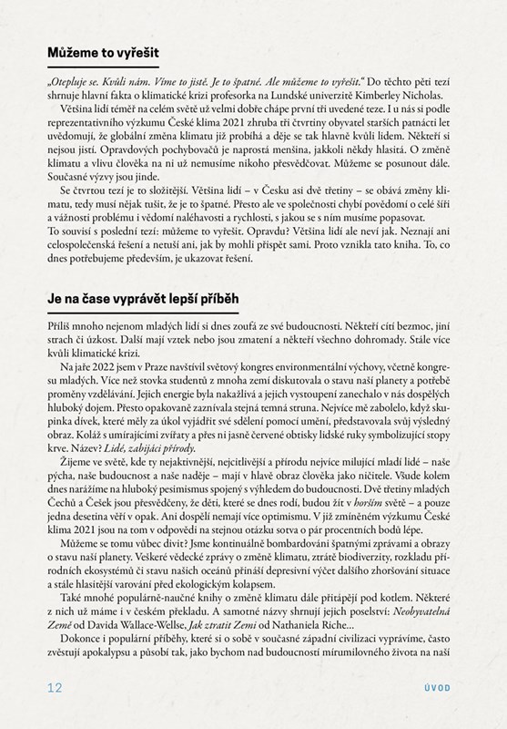 "V dnešní době plné negativních zpráv a ve spleti dezinformací o změně klimatu potřebujeme především ukazovat řešení a pozitivně motivovat ke změně. Tato kniha může být v cestě za lepší budoucností velkou oporou."