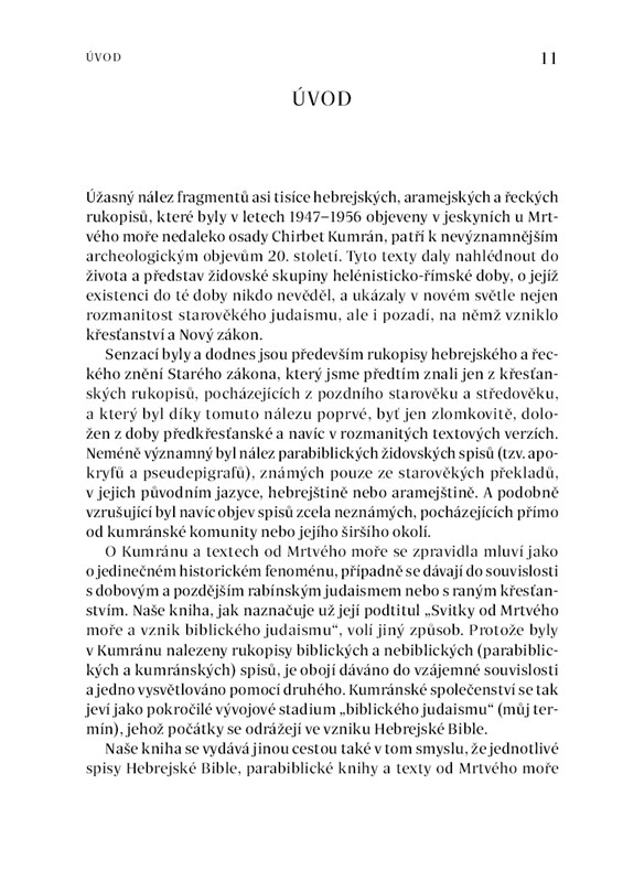 Reinhard Kratz vysvětluje historii nálezů svitků a jejich zkoumání, rekonstruuje organizaci komunity a objasňuje, jak a proč zde bylo napsáno tolik textů. Prochází a komentuje nejdůležitější spisy a ukazuje, že komunita byla součástí hnutí, které se sice odvolávalo na biblické texty, zejména na Tóru a proroky, ale distancovalo se od tradičního židovského obětního kultu. Plasticky tak vystupuje do popředí rozmanitost starověkého judaismu v době Ježíšově a duchovních tradic, na které navazovalo i křesťanství.