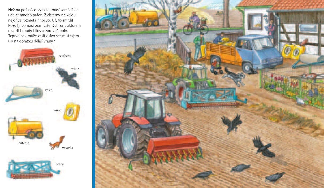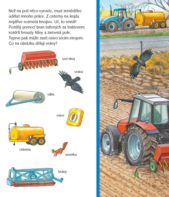 Na statku je spousta práce! Musí se zorat pole, sklidit obilí nebo posekat louka. Najdeš na obrázku cisternu, lopatu nebo třeba kohouta? Tahle obrázková kniha je plná různých zajímavostí a informací ze světa traktorů a kombajnů.