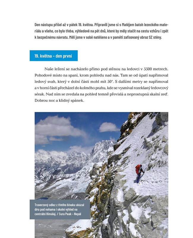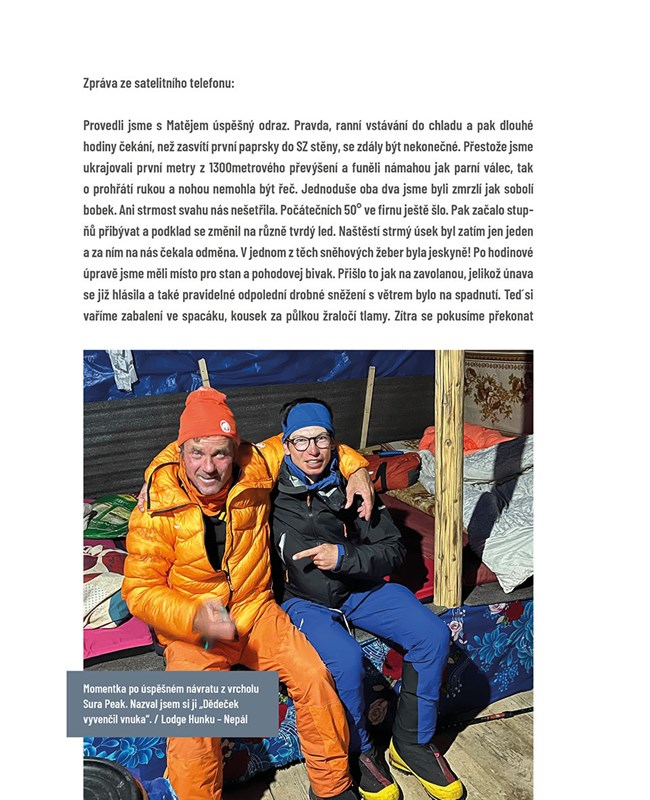 Od opuštění bivaku utekly necelé dvě hodiny a závěrečných výškových 140 metrů je za námi. Není kam stoupat dál. Žádný potlesk či ovace. Naše tváře vytlačují úsměvy, je to ovšem spíš radost, že výš už nemusíme udělat ani krok. Vzájemně se obejmeme, poplácáme po zádech. Rychle vyndáváme foťáky, kamery. Cvak… záznam na filmový pás a celý ceremoniál oslav je u konce. Cítím uvolnění, ale den zdaleka nekončí. Ještě jeden poslední pohled na špičatý svět kolem. Hledím na tu strnulou zamrzlou krásu a snažím se ji vepsat do paměti. Obraz však nikdy dlouho nevydrží, začne blednout, až se zcela vytratí. Jediné, co zůstává uvězněné v barevných vzpomínkách, je strádání, dřina a parťák, se kterým jsem martyrium podstoupil. Pohled klouže na nejbližší horské giganty. Baruntse, které je přímo nadosah, a z druhé strany Čamlang. Najednou cítím silný impuls, nezadržitelná vlna se dere ven. Utírám si slzy, které se mi tlačí do očí. Jistě, povedlo se ti vylézt před lety na jeden i druhý kopec parádní prvovýstup, a támhle ještě Kjašar. Dál k východu Talung a přes dalších pár údolí Kyazo Ri. Seber se a nebul, jelikož na pitvání vzpomínek není vhodný čas. Nehledě na to, že nejvíc tě dostává, že tvůj vlak se již blíží do cílové zastávky, kde bude v nejbližších letech z koleje odstaven. Takže díky, Himálaji… Poslední bůůů a mazej do řitě.