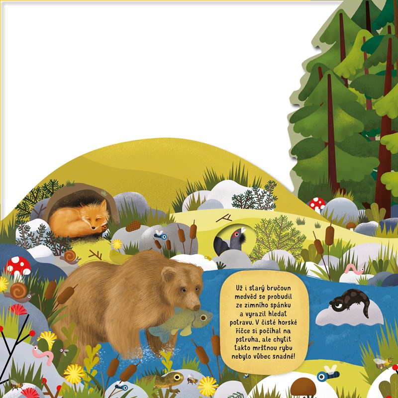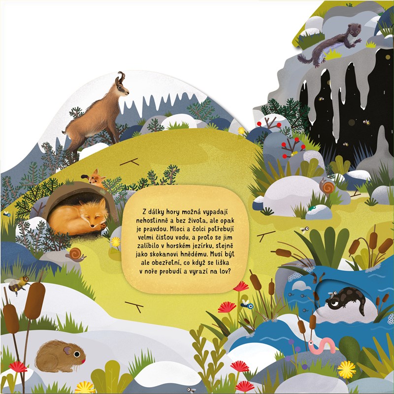 Medvěd se snaží ulovit mrštného lososa v horské říčce, svišti hledají zásoby i pod zbytky sněhu a z výšky to vše pozorně sleduje orel skalní… Kdo další je na horách jako doma? Nazuj pořádné boty a vydej se na průzkum všech horských pater! V leporelu na tebe čeká také spousta nor a dutin, které můžeš procházet neustále tam i zpět.