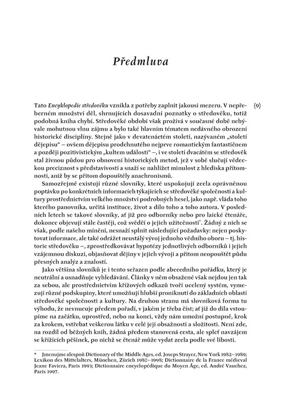 Oblíbená a dnes již klasická práce je dílem předních francouzských i světových odborníků na dějiny středověku. Dva renomovaní francouzští medievisté v ní shromáždili přes osm desítek hesel ve formě samostatných, čtivých esejů. Pokrývají všechny základní oblasti dějin a života středověké Evropy, témata politických dějin (Král, Šlechta, Válka a křížová výprava), dějin hospodářských (Peníze, Řemeslníci, Půda) i kulturních (Katedrála, Poutnictví, Symbol). Mezi autory jsou kromě francouzských historiků i odborníci z Itálie, Německa, Velké Británie, Spojených států, Polska i Ruska. Encyklopedie středověku je jedinečným, obsahově bohatým a jazykově vytříbeným svědectvím o středověkém světě.