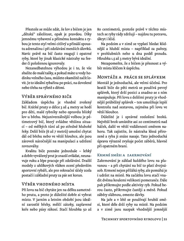 Detailně vysvětluje plavanou, feeder, přívlač, položenou i?moderní závodní přístupy, doplňuje je o?rady k?nástrahám, zakrmování, sezónním strategiím i?výběru vhodného místa. Vše je podané jasně a?přehledně, s?důrazem na praktické použití u?vody. Kniha tak dodává čtenářům jistotu, že jejich každý další krok k?vodě bude sebevědomější a?každý okamžik s?prutem o?něco bohatší.