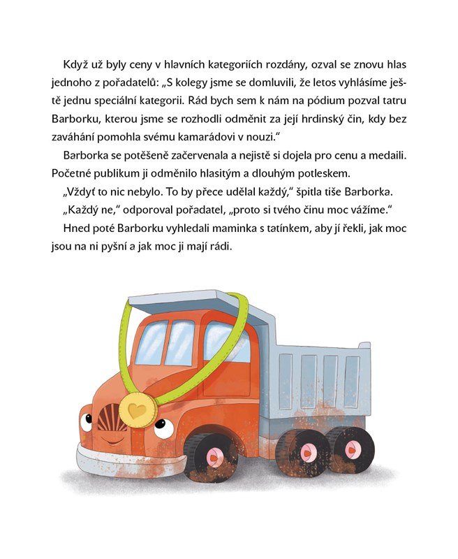 Koho zachránilo popelářské auto? Proč tatrovka Barborka poctivě trénovala na závody? Z jakého důvodu se bagřík bál jet do školky? Jak to vypadá na staveništi? Nevíte? Tak se rychle dejte do čtení.