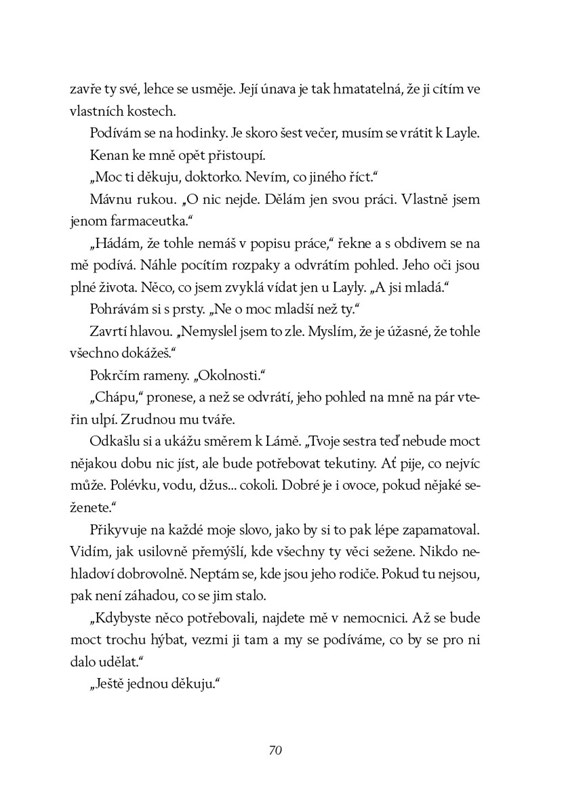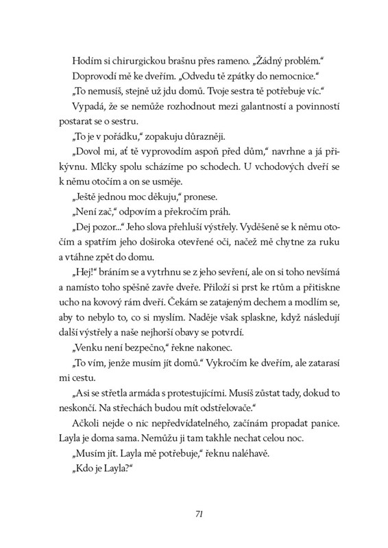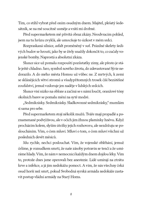 Než Sýrii zachvátilo povstání, byla osmnáctiletá Salama obyčejnou studentkou farmacie. Teď však místo přípravy léků dobrovolničí v nemocnici v Homsu a doufá, že přežije směnu, aby se mohla vrátit ke své těhotné švagrové Layle. Po vyčerpávajících dnech na ni však čeká imaginární Khawf, muž potřísněný krví, který jí našeptává, že musí odejít. Jenže když v nemocnici potká přívětivého Kenana, vše se zkomplikuje. Měla by splnit slib, který dala bratrovi, a zachránit sebe i Laylu, nebo bojovat za svobodu Sýrie?