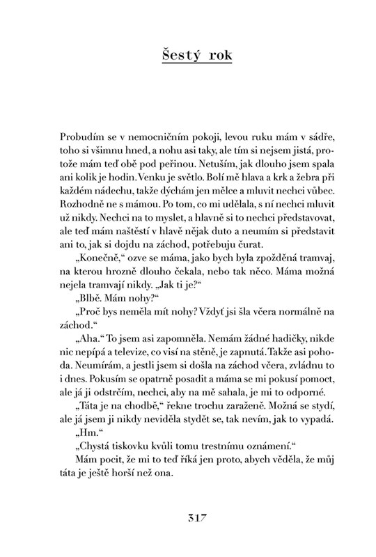 Rebeka a Karolína, těžko říct, čí je to vina. Dvě řadovky, sněhuláci, Bohnice, kolo a nezpevněná krajnice, ze které sjedeš nebo do tebe vrazí vlak, měsíce v kómatu, slzy a Milana, co potřebuje mámu, a Nikola má dvě, v termosce na čaj víno, proutěné košíky, svatby, pohřby a vraždy, Linda tvrdí, že tady něco smrdí, a Saša je v cele, to ještě není celé, ještě Magda, slinivka, provaz a kameny pro toho, kdo by byl zraněný, bolest i naděje, že se to skutečně neděje, že život je jenom demo, ze šlapky jeptiška, banány, pašeráci a obětavá Bety, rozdílné světy, co spolu skončí u poslední věty. Všeho je moc a všechno je krát. Před Bohem za Bohem nikdo nesmí stát, jinak nebudu hrát. A co ten batoh?