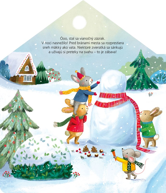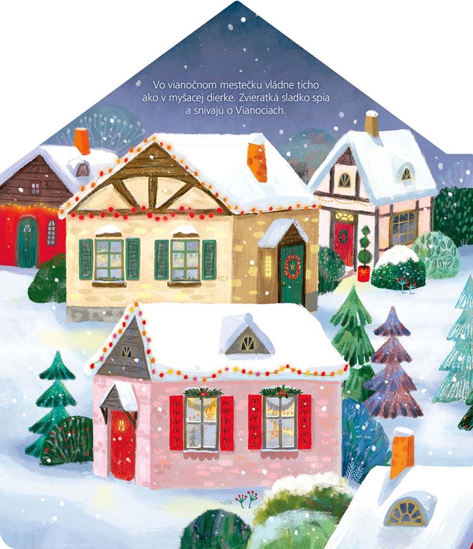 Nakukni do zvieracieho vianočného mestečka! Vianočné prípravy sú v plnom prúde. Ako to tam vyzerá? Každá rodina má svoje zvyky a tradície. Čo zvykne raňajkovať myšacia rodinka na Vianoce? Čím zdobia malé zajačiky svoj vianočný stromček? A kto tak krásne pestrofarebne balí všetky darčeky? Čo sa deje na vianočnom trhu a u koho nájdeš ten najlepší vianočný punč? Nech sa páči, presvedč sa sám: tu smieš pootvárať všetky dvere i okná.