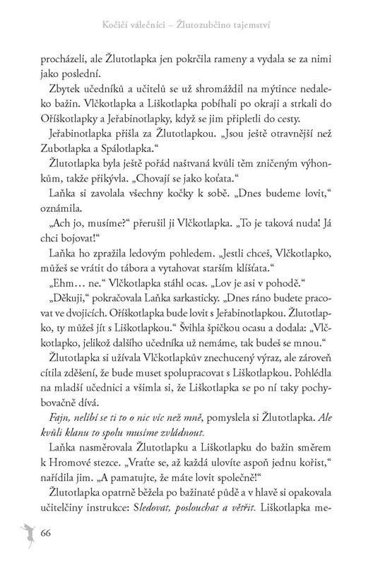Žlutinka se nemohla dočkat, až se stane válečnicí Stínového klanu. Absolvovala bojový výcvik a vysloužila si válečnické jméno, ale v té době už se objevovaly jasné náznaky, že jejím skutečným posláním bude něco mnohem důležitějšího. Jako léčitelka pak Žlutozubka udělala pro svůj klan mnoho dobrého. Jenže ve snech ji pronásledovalo temné proroctví. Hrozba, jejíž naplnění by mohlo být zároveň záhubou všech...