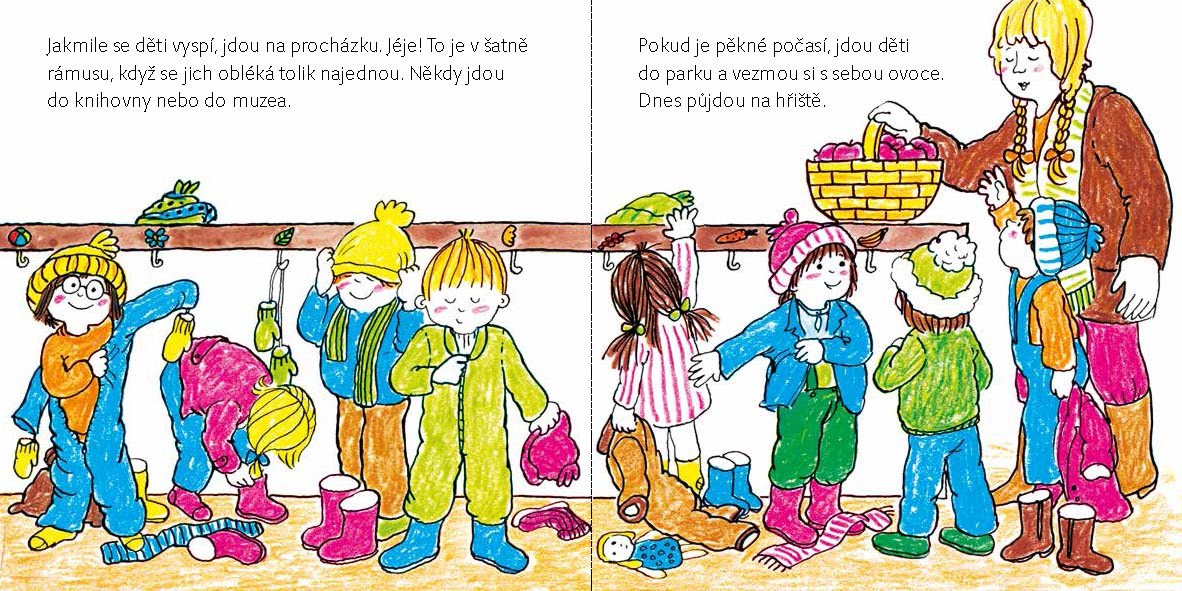 Ema chodí do školky ráda. Má tam bezvadné kamarády. Nejvíc si hraje s Nelou, i když se občas pošťuchují. Ve školce Emu všechno baví, někdy se jí ani nechce domů a maminka s bratříčkem musí počkat, než si Ema dohraje.