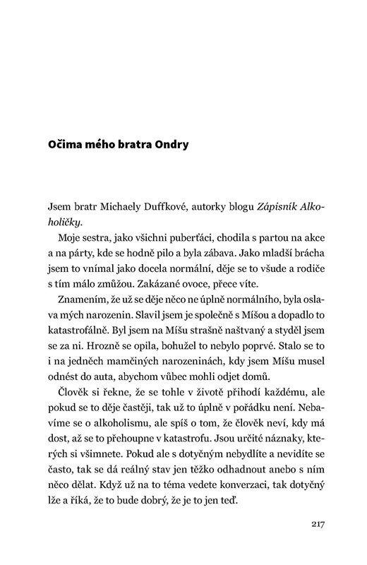 „Příběh Míši Duffkové je skvělým příspěvkem k destigmatizaci ženského alkoholismu a současně unikátní výpovědí o bolesti i naději.“