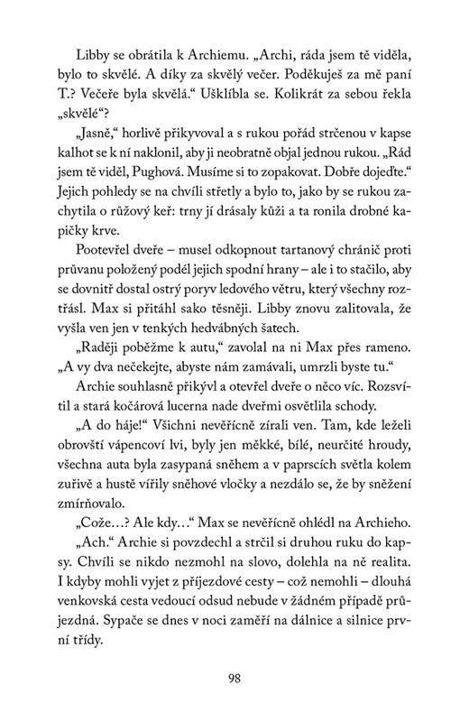 Pohodová vánoční romantika zahalená tajemstvím. Do Vánoc zbývají tři dny a začíná sněžit – doslova chumelí. Libby se nechá přemluvit, že se zúčastní srazu přátel ze studentských let, ačkoli by se mu radši vyhnula. Večírek se koná v opulentním sídle někdejšího playboye Archieho a Libby je nakonec ze setkání mile překvapená. Jenže sněžení neustává, silnice je neprůjezdná a staří přátelé se nedobrovolně ocitají ve společné izolaci. Ke všemu ještě vypadne proud. Najednou jsou uvězněni nejen v zasněženém a poněkud strašidelném domě, ale i v tom, co mezi nimi kdysi zůstalo nevyřčeno.