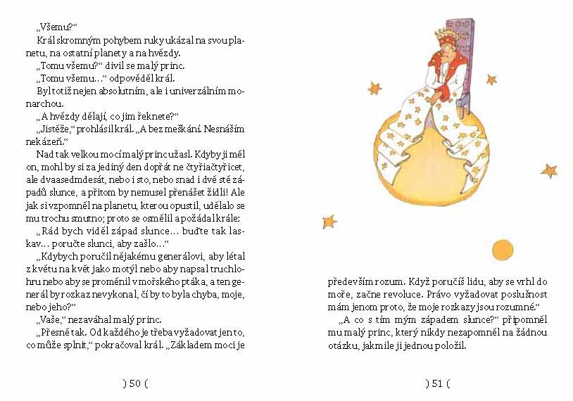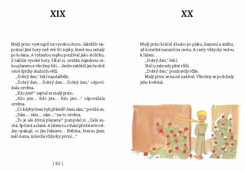 S Malým princem se v africké poušti setkává opuštěný letec, autor této knížky. Zatímco se pokouší opravit havarovaný stroj, povídají si o všeličem. O tajemství podivuhodné pouti Malého prince, o dobru a zlu, o přátelství a kráse, o pravém štěstí, o odpovědnosti za ty, které máme rádi. A vůbec nezáleží na tom, odkud pocházíme: Malý princ pocházel z tak malinké planetky, že si to možná ani neumíme představit. Ale věděl, že je třeba chránit květinu, kterou vypěstoval, a že mu to přineslo větší radost než pijákovi plná láhev, podnikateli peníze a panovačnému králi nezměrná moc. Knížka vychází s původními ilustracemi autora a v novém moderním překladu Richarda Podaného.