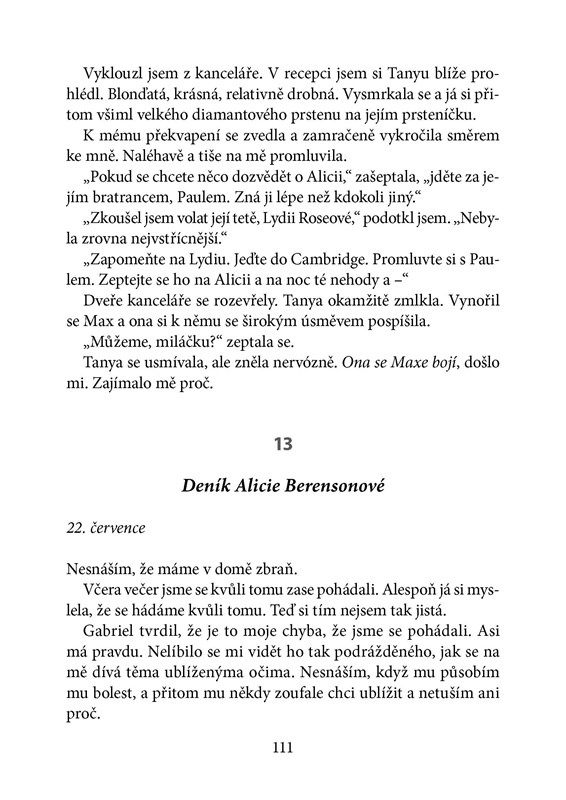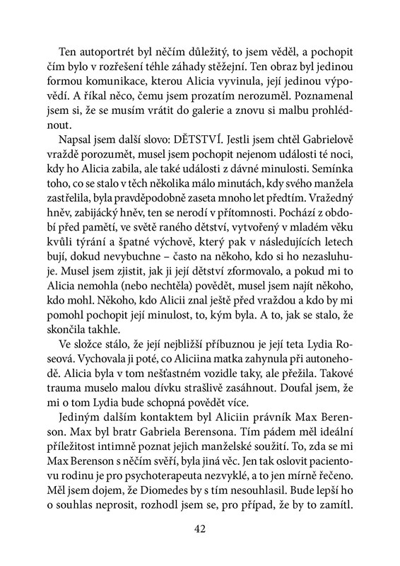 Slavná malířka Alicia Berensonová měla idylické manželství. A pak jednoho dne svého muže zastřelila. Do záhadného případu nemá kdo vnést světlo, protože Alicia od vraždy už šest let nepromluvila ani slovo. Její mlčení chce prolomit psychoterapeut Theo Faber, pro kterého se na první pohled nelogická vražda stane posedlostí. Řešení se možná skrývá v jednom z Aliciiných obrazů. Je však Theo připraven zjistit pravdu?