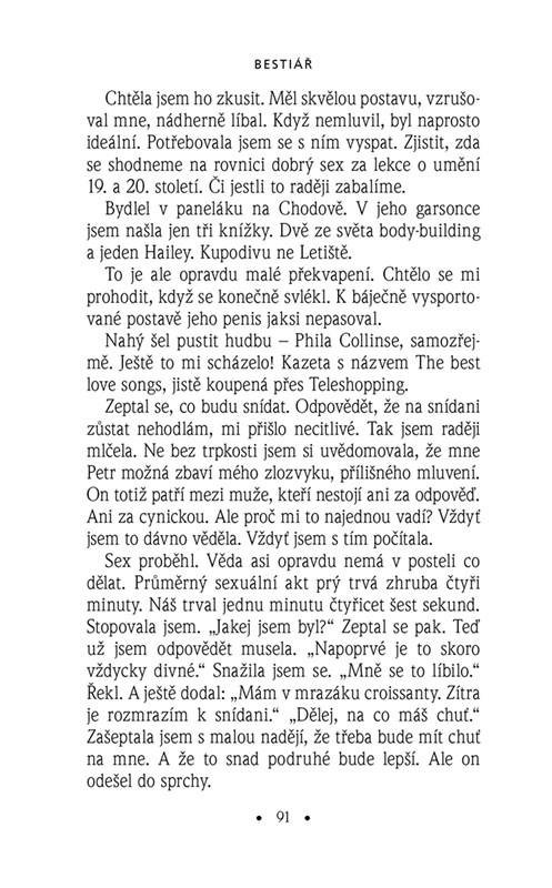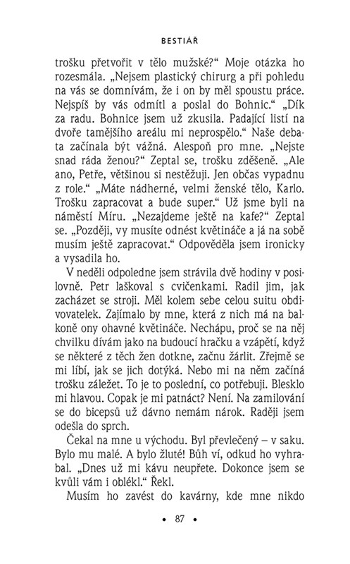 Barbara Nesvadbová se vrací k hrdince Řízkařů, mladé novinářce Karle, která řeší další milostné trable a vážné i humorné problémy s muži. Kolize, které ji potkají, řeší po svém a muži se často ani nestačí divit. Neboť – jak praví hrdinka – bestií se žena nerodí, bestií se stává.