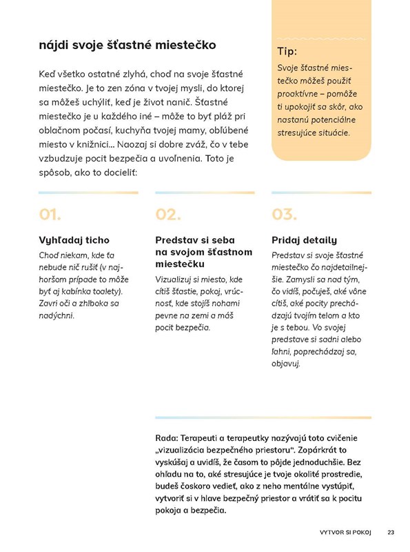 "Bolesť spôsobenú úzkosťou môžeš pociťovať v ktorejkoľvek časti tela. ... Niekto má zrýchlený tep, ďalší sa zas nadmerne potí a tretiemu býva na zvracanie. Všetko sú to reakcie tela na strach a môžu byť skutočne príšerné. Keď nad nami panika naozaj získa nadvládu, ľahko nadobudneme dojem, že je nezvládnuteľná."