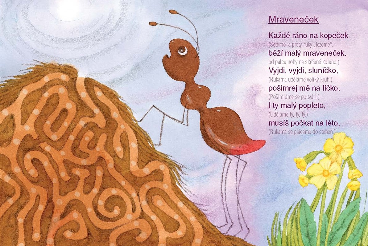 Na 14 stranách plných půvabných i veselých barevných obrázků Dariny Krygielové najdou děti říkadla, která znají z mateřské školy nebo kurzu plavání. Jde o říkadla, u kterých děti cvičí a procvičují pohyb i jemnou motoriku. Pokusili jsme se stručně doplnit rýmy texty, které připomenou dospělým, jak s dítětem cvičit.