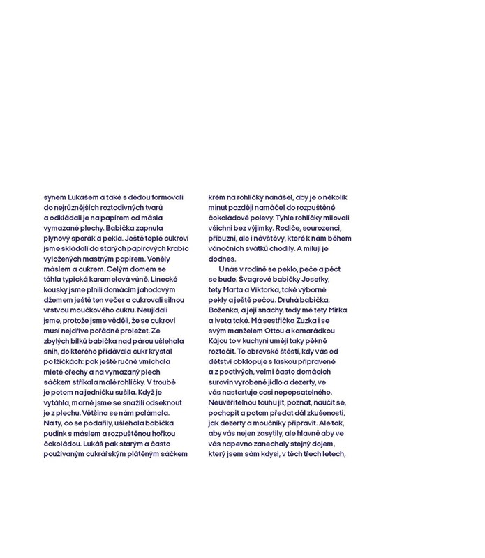 Přemýšlíte, jak dodat svátečnímu pečení jiskru? Zkuste tentokrát rozvonět svou kuchyni trochu jinak! V šedesáti unikátních receptech inspirovaných dětstvím, zážitky z cest i aktuálními světovými trendy vám ukážu, jak z klasického cukroví udělat něco výjimečného. Podělím se s vámi také o své tajné tipy, takže společně zvládneme cukrařinu špičkové úrovně přímo u vás doma. A co vás všechno čeká? Sušenky s polevou z pomerančové vody, fíkový salám s rumem a pistáciemi, makové tyčky s meruňkovou marmeládou, kakaové dortíčky s medovou pláství, perníkový řez s želé ze svařeného vína nebo třeba smažené tvarohové vločky. Pojďme se do toho pustit – sladce, s láskou a společně!
