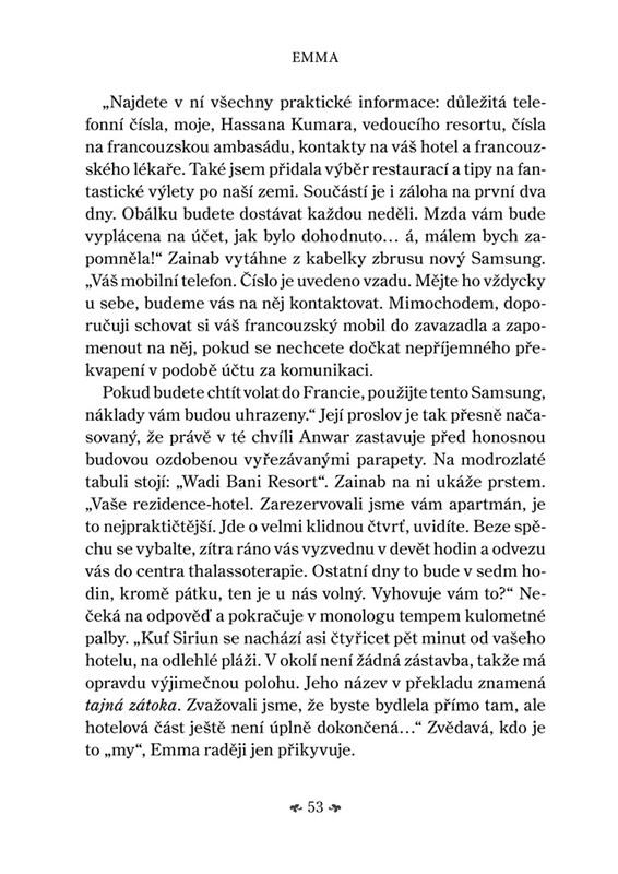 Emma, která pracuje jako masérka v jednom z bretaňských center thalassoterapie, přijme nabídku vyškolit personál luxusního wellness centra v Ománu. Exotická země ji zcela okouzlí, stejně jako šéf resortu, syn vlivného ministra. Neskutečně přitažlivý muž však za svým okouzlujícím úsměvem skrývá nejedno tajemství – a Emma se tak ocitá uprostřed smrtelně nebezpečných politických intrik. Začíná hra na kočku a myš plná pronásledování, nástrah a nečekaných zvratů. Emma se však nehodlá stát snadným terčem…