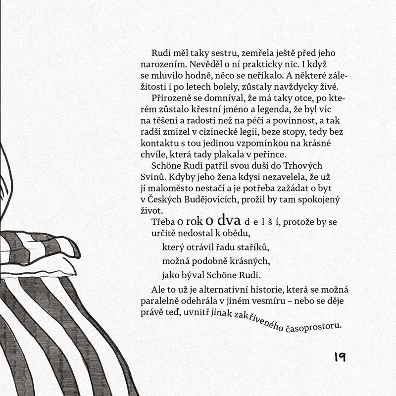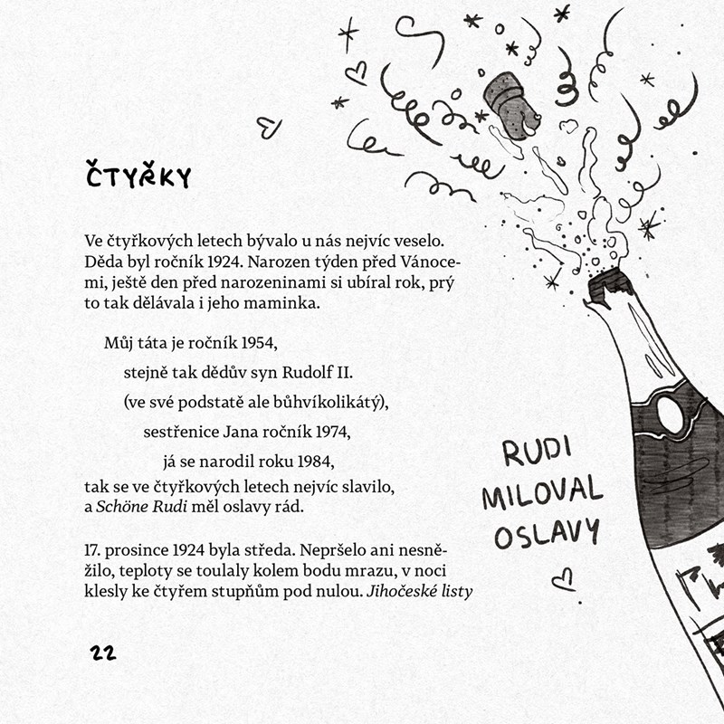 Říkával o sobě, že vypadá jako Sean Connery, a chtěl, aby ho oslovovali „krásný Rudi“… Jan Štifter v nové knize shromáždil vzpomínky na svého dědečka Rudolfa – muže, jehož život byl prosycen šarmem, nadhledem a vášní. V jeho příběhu ožívá nezapomenutelný svět venkovských Trhových Svinů i rušnějších Českých Budějovic. Štifter se pomocí tradovaných příběhů, archivních stop i vlastní paměti vydává ke kořenům, aby prostřednictvím Rudiho a dalších předků přiblížil postavy, jejichž životní kroky se hluboce otiskly do paměti rodiny a místní historie. Atmosféru knihy dokresluje originální autorská obrazová příloha vytvořená umělou inteligencí, která ve spojení s ilustracemi Sabiny Třeškové a unikátní grafickou úpravou Kateřiny Urbanové každou vzpomínku prohlubuje a propojuje minulost s vizuální fantazií.
