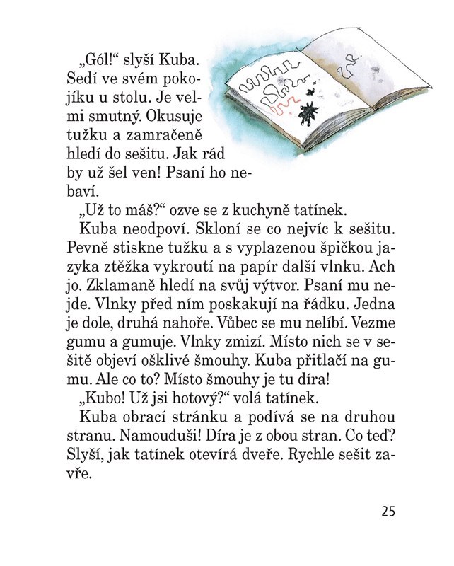 Kuba nechce číst, psát ani počítat. Do první třídy se mu vůbec nechtělo. Co si však počít s žáčkem, kterému se v hlavě honí všechno možné, jen ne škola? Paní učitelka z 1. A na to přišla! Od chvíle, kdy dostala ten skvělý nápad, začaly děti chodit do školy s nadšením. Dokonce i Kuba. A cože to paní učitelka báječného vymyslela?