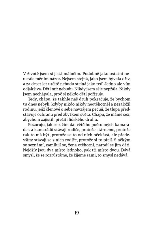 Nikdy si nepřála děti. Osm let už chodí s Philipem a vždycky byli zajedno, že je mít nebudou – aspoň doteď. Protože co když si Philip začíná uvědomovat, že by se možná tátou stát chtěl? Do toho spolu její nejlepší kamarádi čekají první dítě a matka by si přála vnoučata. Najednou jsou všude kolem novopečení rodiče, porody nebo kamarádi, kteří mají pocit, že jim utíká čas, zatímco ona sama si stojí za svým rozhodnutím děti nemít. Nebude toho ale jednou litovat?