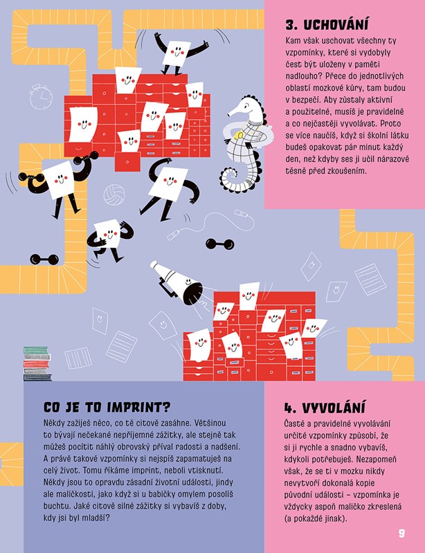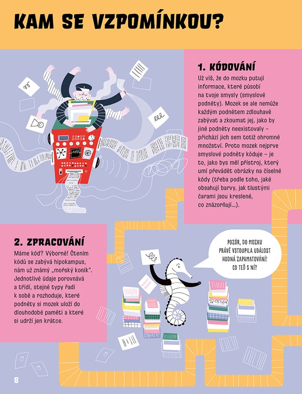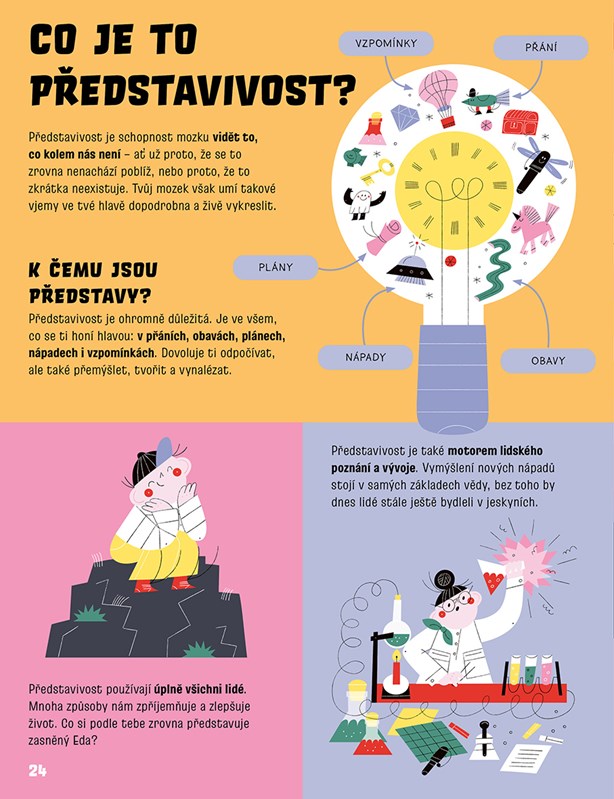 Lidský mozek je ohromně složitý. A taky mimořádně zajímavý! Jak vlastně funguje? Proč si tak snadno zapamatuješ jména svých oblíbených seriálových hrdinů i jejich protivníků, ale matematický vzoreček nebo důležitý letopočet si do hlavy ne a ne uložit? Proč se myšlenky různých lidí vzájemně tak liší, že si někdy vůbec nerozumíme? Jak se tvoří sny? Můžeme si paměť představit jako rozlehlou knihovnu? A co má představivost společného se symfonickým orchestrem? Nahlédni do fascinujícího světa lidské paměti a představivosti a odhal jejich tajemství…