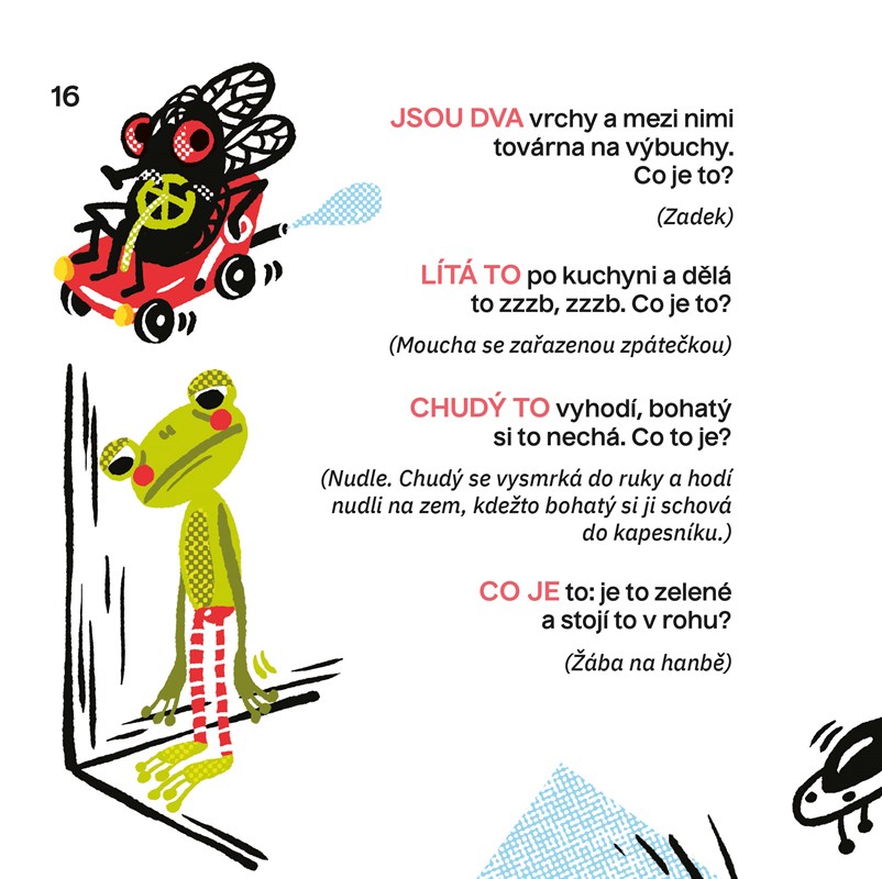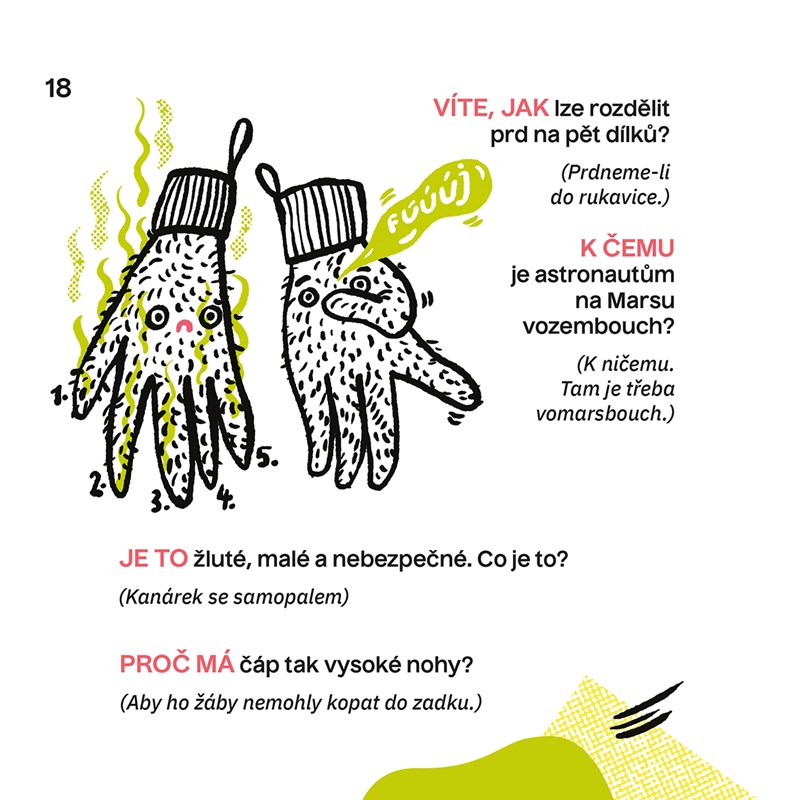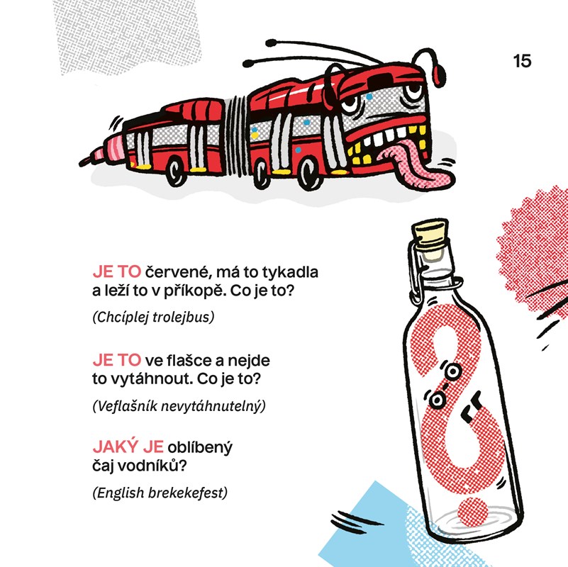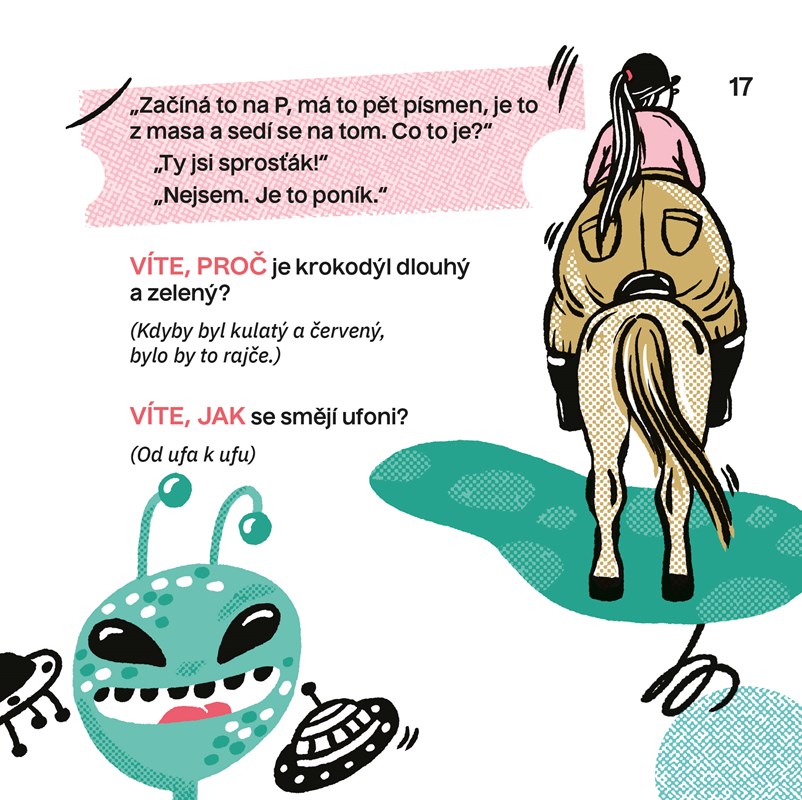 V této knížce najdete různé druhy vtipů: poetické, pohádkové, suché, drsné, černé, šibeniční, trampské, skotské, zvojtěné čili popletené, vousaté, zvané též staré vraždy, co si vyprávěli už vaši pradědečkové, anebo bláznivě nesmyslné, kterým Češi říkají kameňáky či šutráky a Angličani příběhy chundelatého psa (shaggy dog stories). Na konci vás čeká bonus, kde nahlédnete do humoru dospělých. Zjistíte, že slova můžou mít víc významů a že k pochopení vtipů je dobré vlastnit v hlavě nějaké vědomosti. Kdo se směje, ten se učil. A kdo se směje naposled, ten má dlouhé vedení.