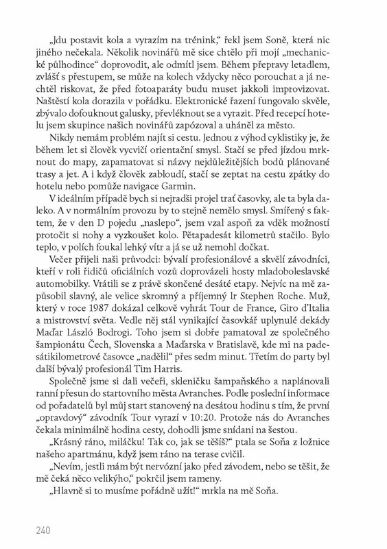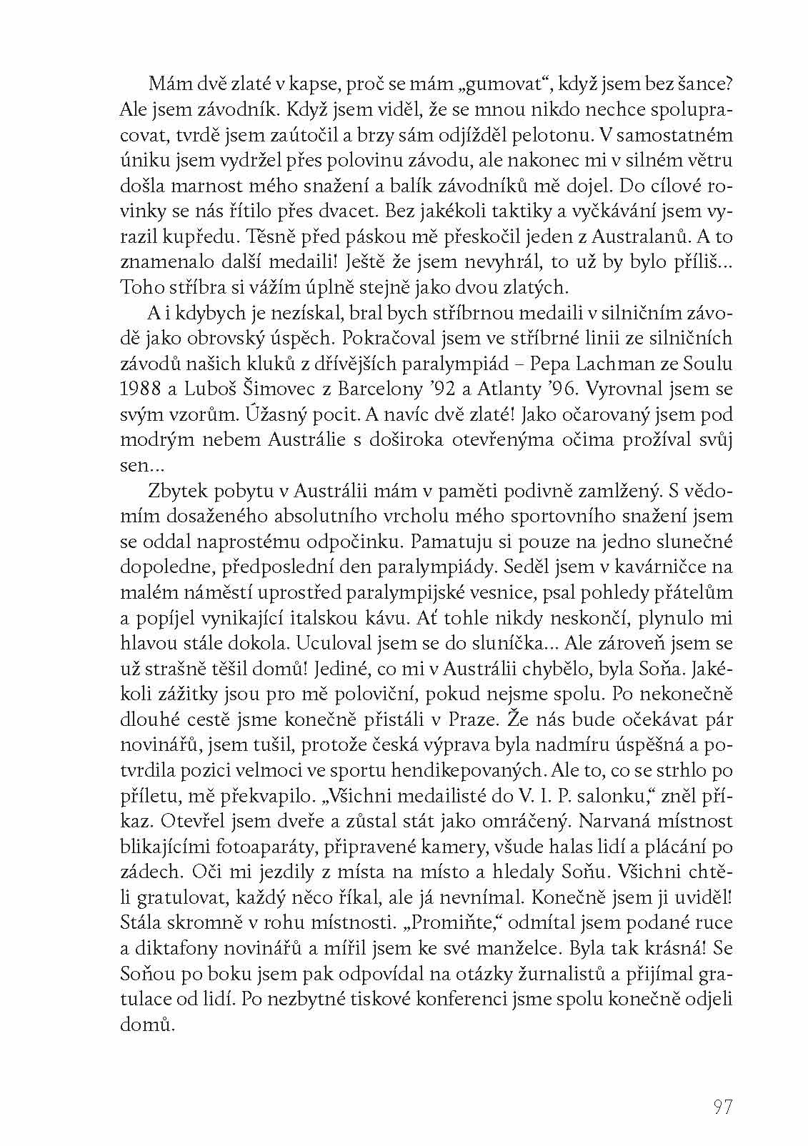 „Ze všech zlatých medailí je tahle tou nejzlatější. Vydřená, vyvzdorovaná, překvapivá. Navíc znamená zápis do dějin mého milovaného sportu. Na oficiální tiskové konferenci první otázka zněla: „Uvědomujete si, že tímhle vítězstvím jste se stal nejúspěšnějším cyklistou paralympijské historie?“ Co na to říct? Kde je hranice, kdy na sebe může být člověk opravdu pyšný? Neskromně přiznám, že ten večer jsem usínal s pocitem, že jsem tu hranici našel a překročil.“