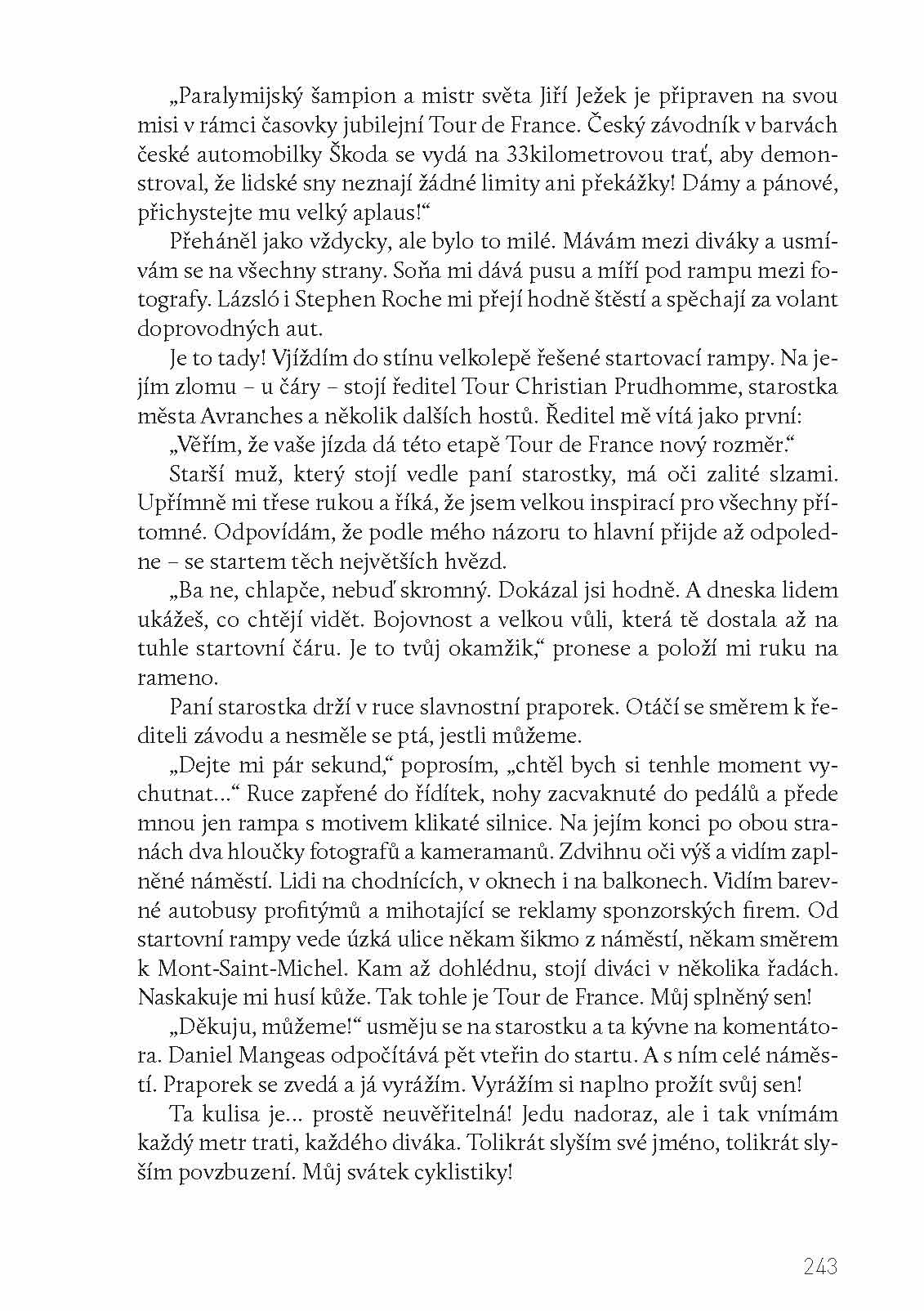 Cyklista Jiří Ježek (1974) je nejúspěšnější hendikepovaný sportovec paralympijské historie a také jeden z nejznámějších českých sportovců současnosti. Navzdory těžkému úrazu (v jedenácti letech přišel o nohu) se od svých dvaceti let věnuje cyklistice – o pět let později se poprvé dostal na vrchol a na začátku 21. století se stal profesionálním sportovcem. Už mnoho let získává nejcennější trofeje sportu hendikepovaných – zlaté medaile na paralympijských hrách, tituly mistra světa a Evropy. Často také startuje po boku nejslavnějších „zdravých“ profesionálů na významných závodech na celém světě. V roce 2013 se představil v rámci časovky jako oficiální předjezdec na Tour de France. Svůj start na Tour označil jako další sen, proměněný v nádhernou realitu.