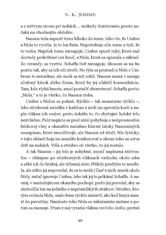 Pre Nassun je však neskoro. Videla, aký je svet zlý, a pochopila to, čo jej matka odmieta pripustiť: že skazené sa nie vždy dá napraviť. Niekedy pomôže iba to zničiť.