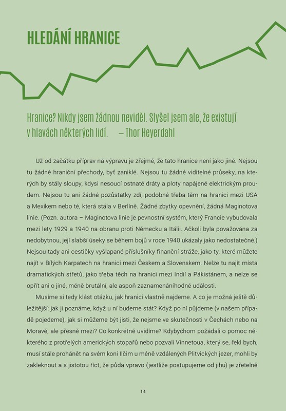 Autor s jemným humorem a obdivem popisuje, jak lidé většinou netuší, kudy tato hranice vede. To mu poskytuje skvělou příležitost k objevování a přemýšlení nad zdánlivě obyčejnými věcmi. Kniha přináší nejen podrobnou trasu hranice a historické poznatky, ale také pohled na kulturní a společenské rozdíly mezi regiony. Čtenář se ponoří do směsi příběhů, zajímavých osobností, hraničních kamenů i hravých, někdy až absurdních zážitků. To vše zarámováno vtipnými postřehy a nečekanými paralelami k objevování světa.