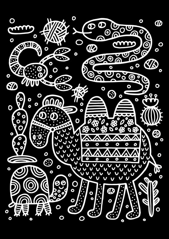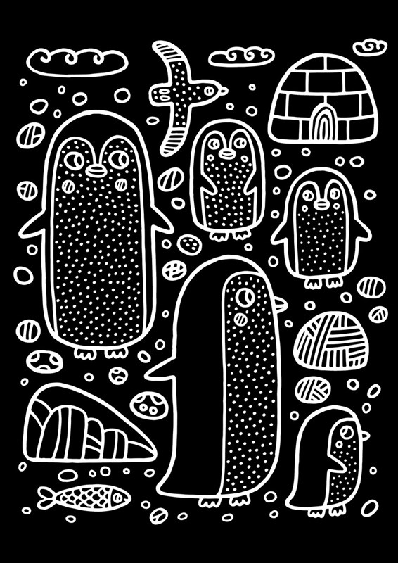 V našem originálním výtvarném sešitu je všechno naopak! Obvykle černé kontury půvabných obrázků jsou bílé a pozadí naopak černé… tak to tu ještě nebylo. Místo vybarvování celých ploch stačí pestrými pastelkami či neonovými fixy vymalovat jen bílé linky nebo některé z nich pro změnu jednoduše nechat prázdné.