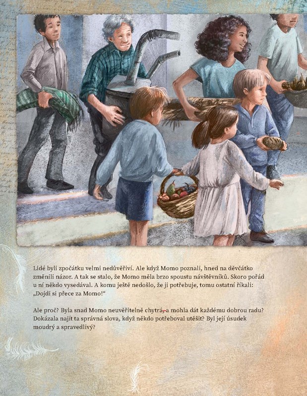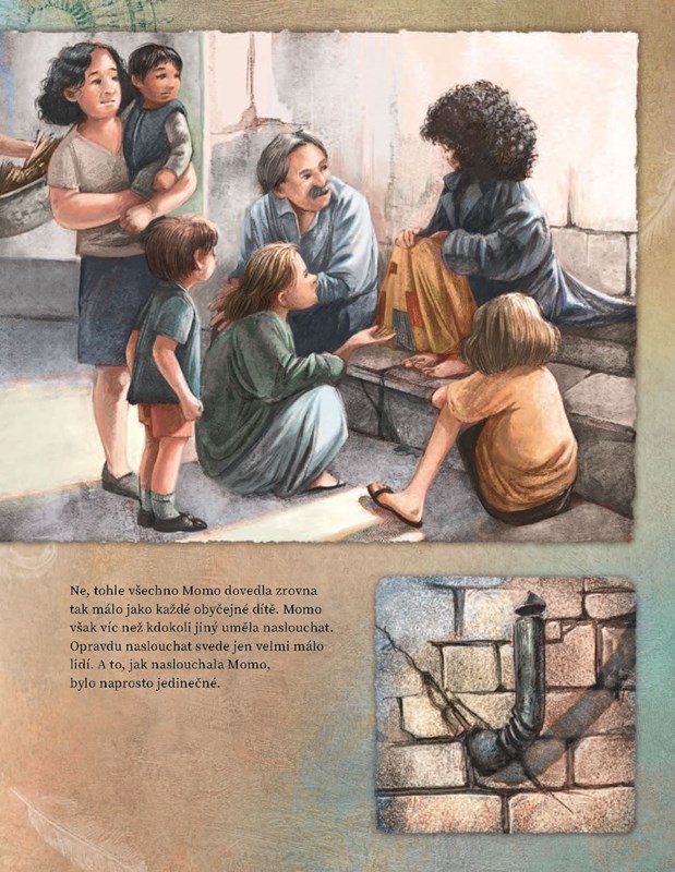 Na okraji velkoměsta, v ruinách amfiteátru, žije Momo. Nikdo neví, odkud pochází, ale všichni vědí o jejím zvláštním daru: Momo umí velmi zvláštním způsobem naslouchat. Naslouchá lidem ve městě, dětem, dokonce i zvířatům a větru ve stromech. Když Momo naslouchá svému kamarádovi Gigimu, najednou vymýšlí ty nejneuvěřitelnější příběhy. A pouliční metař Beppo, který obvykle mlčí, najde s Momo ta správná slova a může se s ní podělit o svou velkou moudrost: Cesta, která se zdá nekonečně dlouhá, se dá urazit jen krok za krokem.