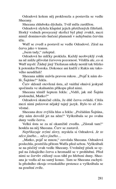 Nyní se však Ztracení vracejí, aby získali ještě větší moc. A zatímco různé frakce soupeří o kontrolu nad pozůstatky impéria, z pouště Rakis se vynořuje dívka jménem Sheanna a šíří galaxií náboženský zápal, neboť dokáže to co fremenští jezdci písku – a naplňuje proroctví, jež předpověděl zesnulý Božský imperátor…