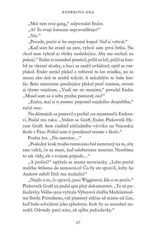 Ender teda pripomína stratené rozzúrené šteniatko a čitateľ mu, napriek okolnostiam, v istom bode začne držať palce. Na stránkach potom sleduje to, ako rastie a ako sa mení. Ako prekonáva prekážky a vedením určené míľniky. Na jednej strane je fascinujúce vidieť jeho rast a geniálnu myseľ. Na tej druhej tieto udalosti v čitateľovi vyvolajú celú škálu protichodných pocitov.
